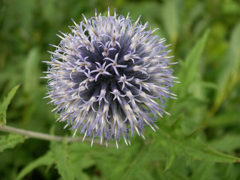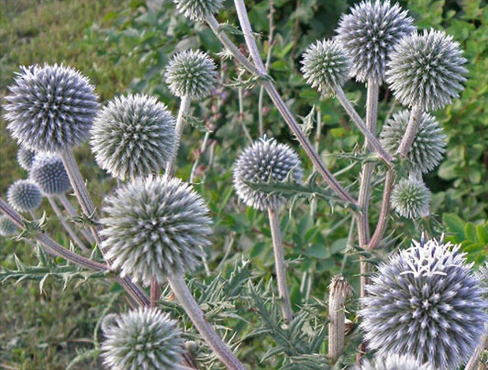 Мордовник - высокое, до 2м, травянистое растение, с прямым разветвляющимся к верху стеблем. Корень массивный, стержневой. Листья вытянутые, колючие, перисто-рассеченные. Верхняя часть листа темно-зеленая, ворсистая, нижняя – белесая, пушисто-шероховатая. Цветы бело-голубые, до синего, собраны в соцветия в виде колючих шариков, до 5см в поперечнике. В соцветии собирается до 350 цветков, а на стебле вырастает до 30 соцветий. Плод – продолговатая, сильно вытянутая семянка до 8мм, покрытая волосками. Семечки объединены в плотные шарики-соцветия. На первом году это растение формирует розетку из листьев до 70 см. На второй год – отращивает стебель, который ветвится и цветет. Цветет этот медонос с начала июля, цветение длится до 40 дней. Цветы остаются открытыми на протяжении светового дня.