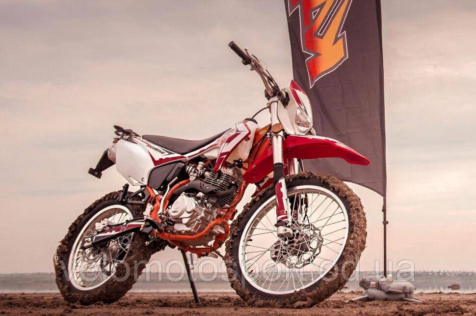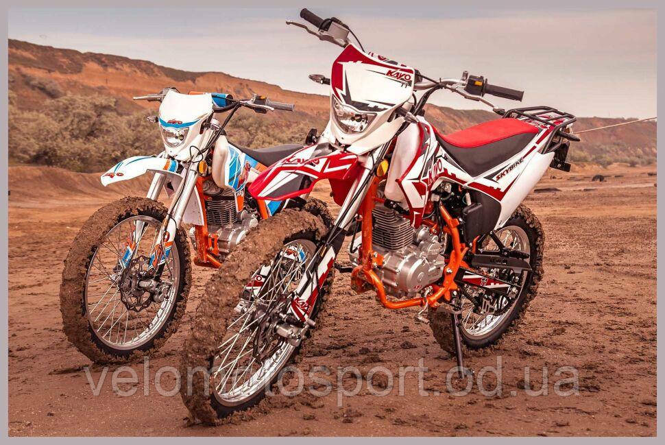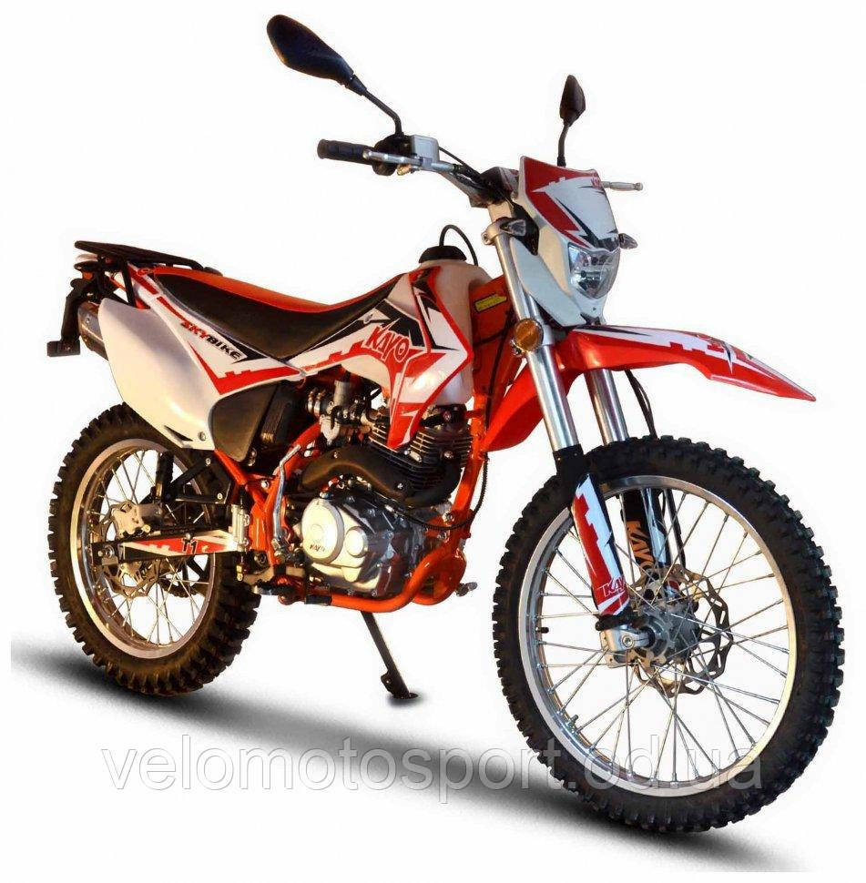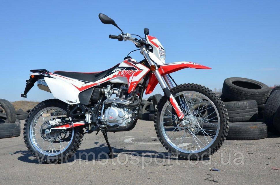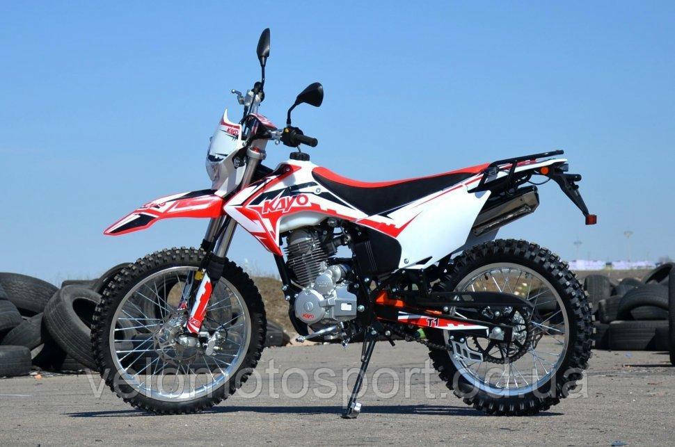 Телефоны для заказов : 093-100-95-92;068-551-71-04;095-758-06-52; Мотоцикл KAYO Кайо T1-250 - это упрощенная версия мотоцикла KAYO T2. На мотоцикле установлен тот же 1 цилиндровый, 4-х тактный двигатель воздушного охлаждения ZS169FMM производства ZONGSHEN, с верхним распредвалом с мощностью 16,4 л.с. при 7000 об.мин., с объемом 223 см.куб. Несущая рама KAYO T1 немного тоньше, что подразумевает меньшие возможности мотоцикла. Топливная смесь подается с помощью карбюратора NIBBI 28, зажигание электронное. Передняя вилка перевернутого типа длиной 800 мм, не регулируемая, передний дисковый тормоз с двухпоршневым суппортом. Задняя подвеска выполнена на линке прогрессии с моноамортизатором. Задний дисковый тормоз оснащен однопоршневым суппортом. Тормозные колодки бесасбестовые. Коробка передач механическая с международной схемой переключения 5-ю передачами и нейтралкой. Приводная цепь 520-я CHOHO, соотношение ведущей и задней звезды 13Т-45Т. Топливный бак прозрачный, в отличие от T2, но немного меньшей емкости. ТЕХНИЧЕСКИЕ ХАРАКТЕРИСТИКИ: