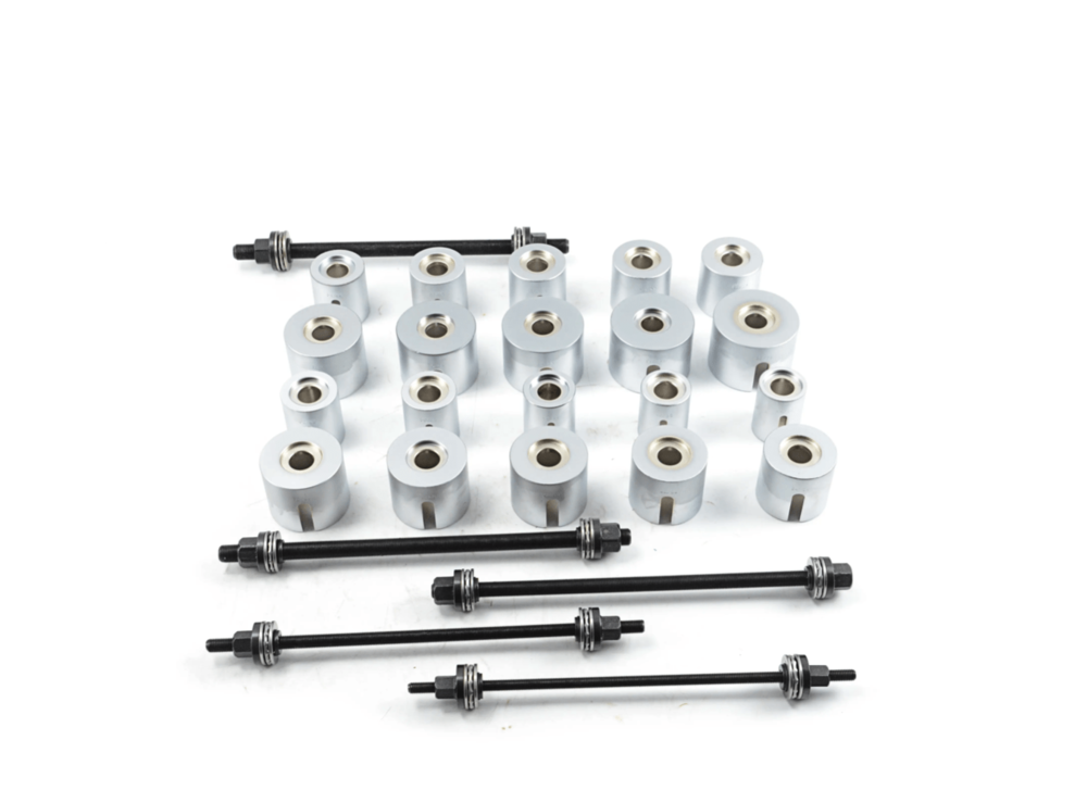 Комплект REWOLT T2036 предназначен для установки и демонтажа втулок, подшипников и сайлентблоков. Этот профессиональный набор включает в себя пресс-гильзы, шпиндели и гайки.