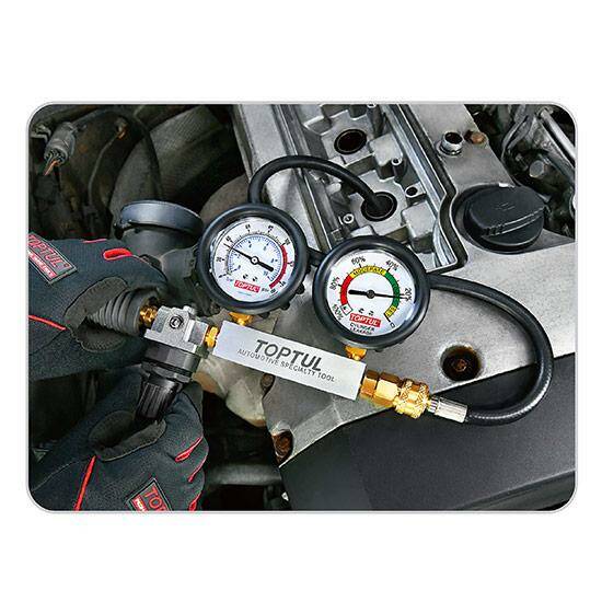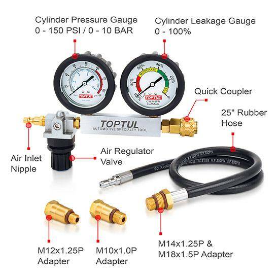Набор TOPTUL JGAI0404E предназначен для диагностики герметичности цилиндров двигателя, помогая выявить такие распространенные проблемы, как изношенные поршневые кольца, трещины в головке блока цилиндров, прогоревшие или негерметичные клапаны и поврежденные прокладки головки.