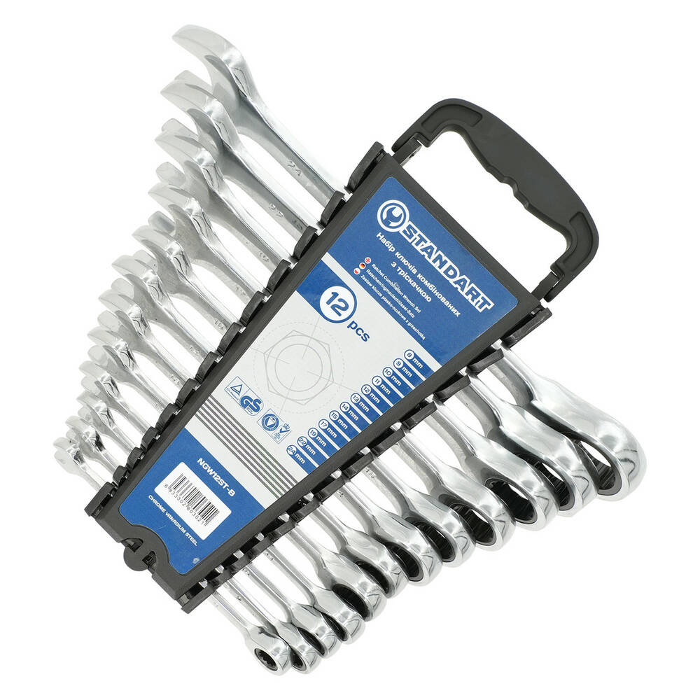Набор комбинированных ключей с трещоткой СТАНДАРТ NGW12ST-B разработан для эффективного выполнения широкого спектра ремонтных и монтажных работ. Благодаря встроенному трещоточному механизму каждый ключ обеспечивает комфортное и быстрое закручивание или откручивание креплений, существенно экономя время и усилия пользователя.