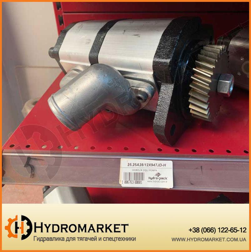 Гидравлический шестеренный насос Hydro-pack 25.25A28/12X947JD группы 20+20, с объемом 28+18 см3/об, имеет левое вращение (против часовой стрелки). Применяется для установки на трактор: