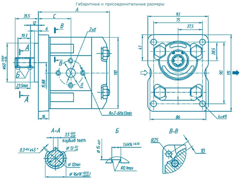 Перед монтажом насоса НШ4 проверьте совпадает ли направление вращения вала ведущей шестерни, которое указано на крышке насоса, с направлением вращения привода (выходного вала редуктора, электродвигателя и т. п.). Привод должен исключать передачу радиальных н осевых усилий на ведущий вал насоса, а также обеспечивать возможность его радиальных перемещеннй до 0,3 мм.