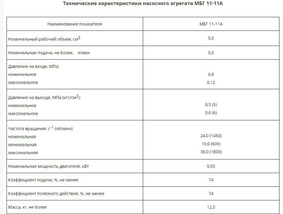 Насосный агрегат МБГ-11-11А применяется в различных гидравлических устройствах для нагнетания в них постоянного по величине давления. Для нормального функционирования данного насоса масло, которое используется в системе, должно иметь тонкость очистки 40 мкм и не содержать примесей, которые вызывают коррозию внутренних частей.