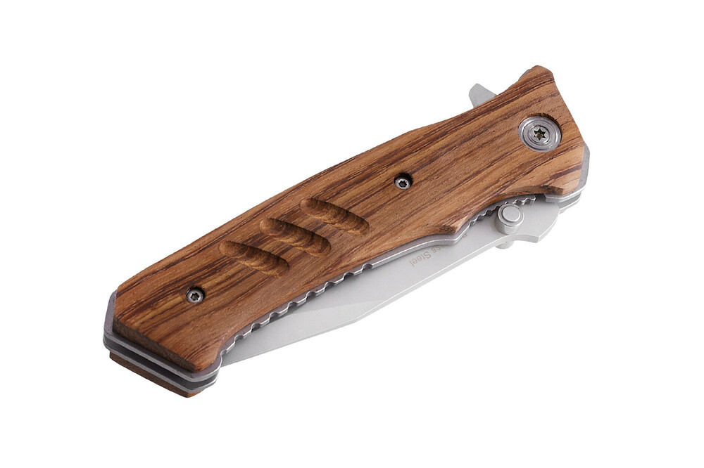 Рукоять ножа, с углублениями под пальцы, изготовлена из стальных пластин с крупными деревянными накладками. Для удобства удержания, на накладках нанесен специальный рельеф. Используемая для накладок древесина не боится влаги и не склонна к гниению, приятна на ощупь и замечательно выглядит. Толстые накладки делают рукоять удобной для силовых работ.