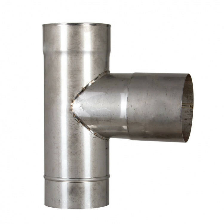 Одностенный тройник 87° Ø120 мм для дымоходов из нержавеющей стали – это элемент дымохода, который входит в очень важный «узел» дымоходной системы при проходе дымохода через стену в смежное помещение или на улицу относительно дровяной печи или камина. Данное изделие связывает вертикальную часть дымохода, которую по правилам монтажа необходимо собирать «конденсату», и горизонтальную часть, которая собирается по «дыму». Также тройник дает возможность установить ревизию, которая позволяет выкинуть сажу после прочистки вертикальной части дымохода, а также является элементом дымохода который собирает конденсат. Для производства этого элемента дымохода используется сталь: