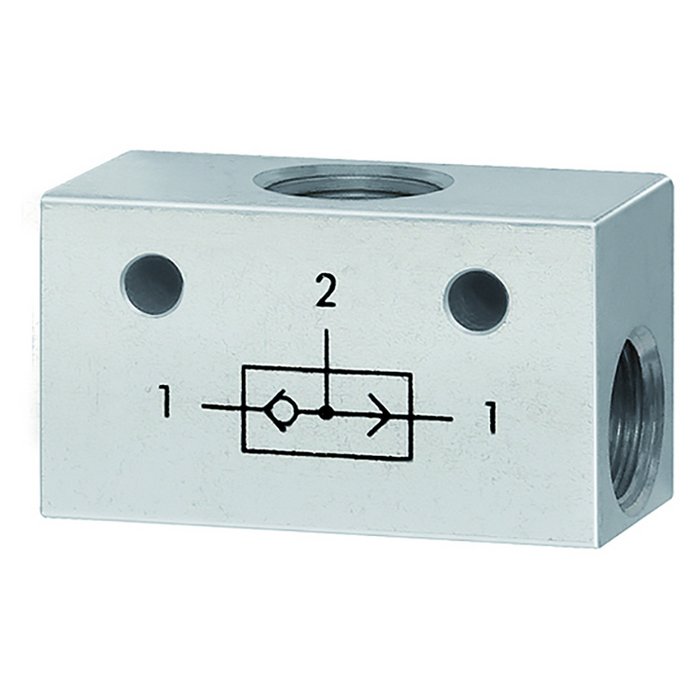 The valve has two inlets and one outlet. A signal appears at the outlet when the left or right inlet is pressurised. <br>If the pressure at the two inlets is different, the stronger of the two signals appears at the outlet.