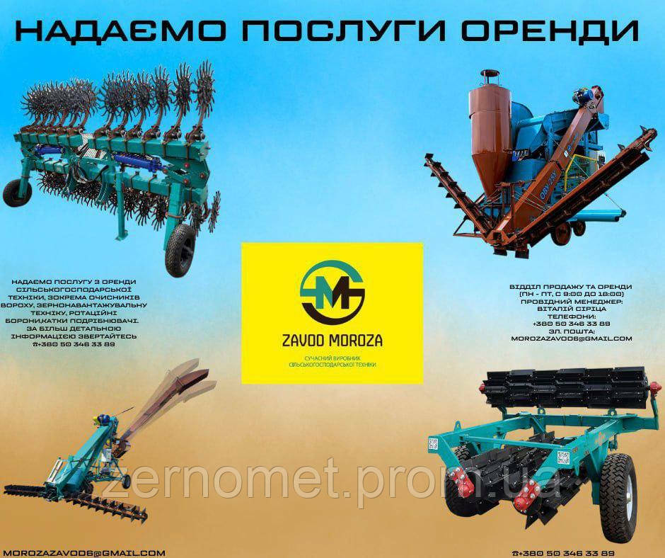 Надаємо послугу з оренди сільськогосподарської техніки, зокрема очисників вороху, зернонавантажувальної техніки, ротаційні борони, катки подрібнювачі, тощо. За більш детальною інформацією звертайтесь  ☎️ +380 50 346 33 89 або заповніть та надішліть форму на сторінці, посилання на яку розташовано нижче. https://zavodmoroza.com/orenda