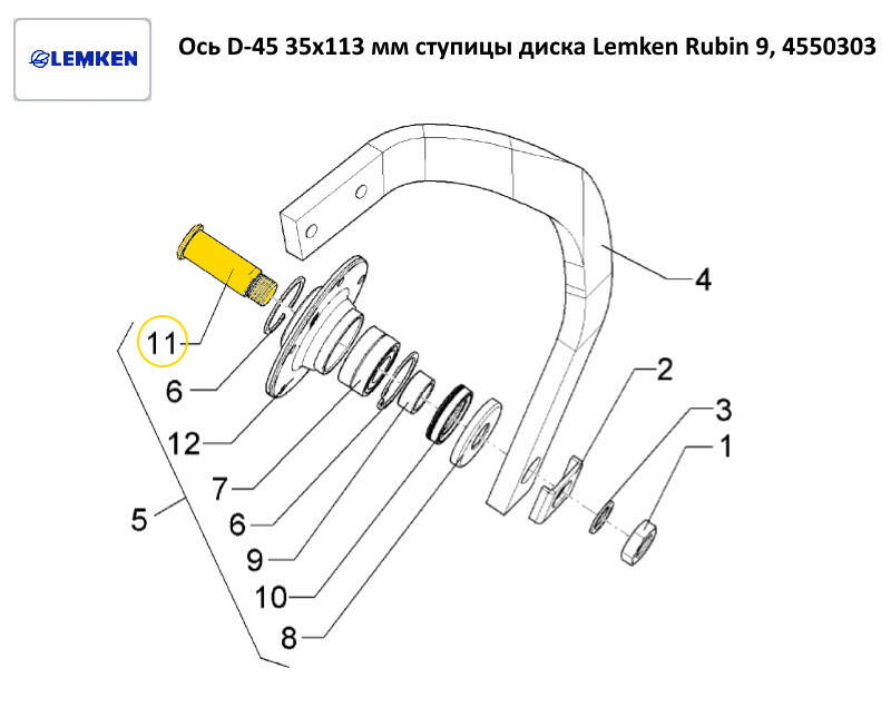 Ось D-45 мм 35х113 мм ступицы диска Lemken Rubin 9, 4550303