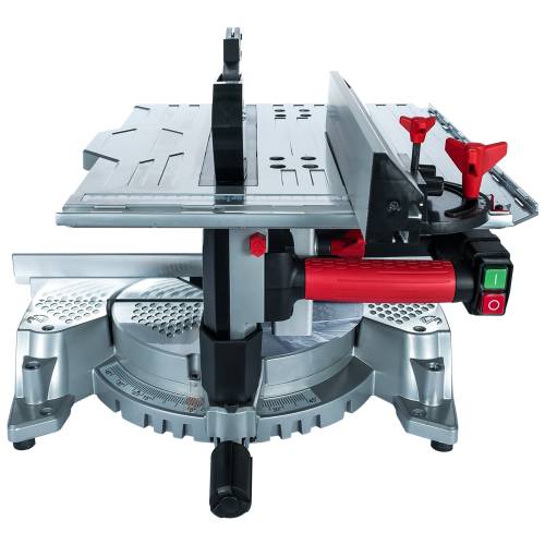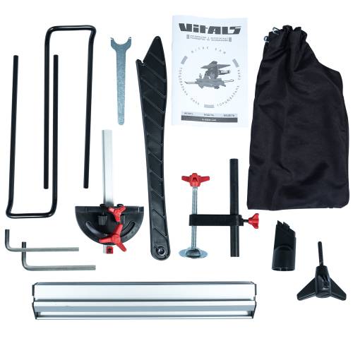 У комплектації: набір ключів, різальний диск – 80Т, шкала кутів, пилозбірний з’єднувач, знімний розширювач столу – 2 шт., повздовжній упор, затискач-струбцина.