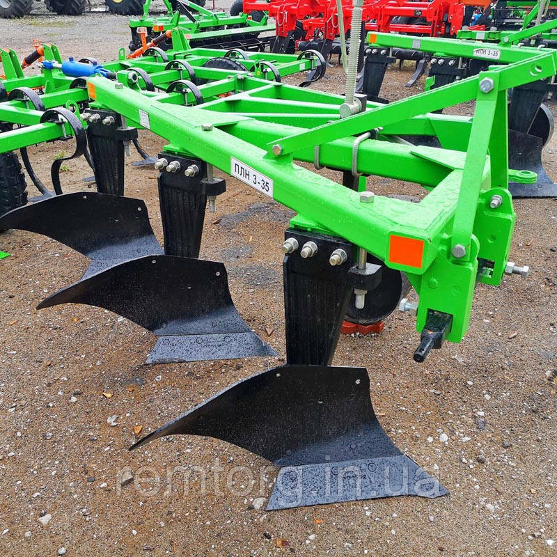 Плуг ПЛН 3-35 под углосним предназначен для пахоты почв, не засоренных камнями, плитняком и другими препятствиями, под зерновые и технические культуры на глубину до 30 см, с удельным сопротивление почвы до 0,09 MПa и твердостью до 4,0 MПa. Оснащен отвалом полувинтовым.