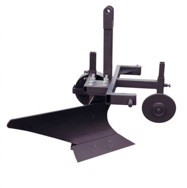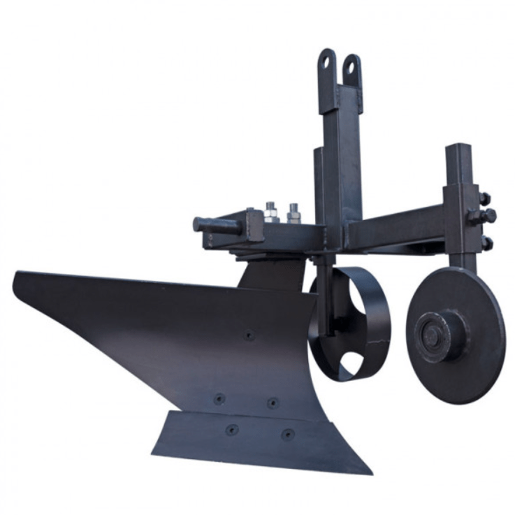 Корпус плуга съемный, легко фиксируется к раме с помощью четырех шипов, что упрощает техническое обслуживание и замену рабочих частей. Плуг оснащен стальным опорным колесом с втулкой — установлен на регулируемом кронштейне, что позволяет точно настроить глубину вспашки и стабилизировать ход во время работы.