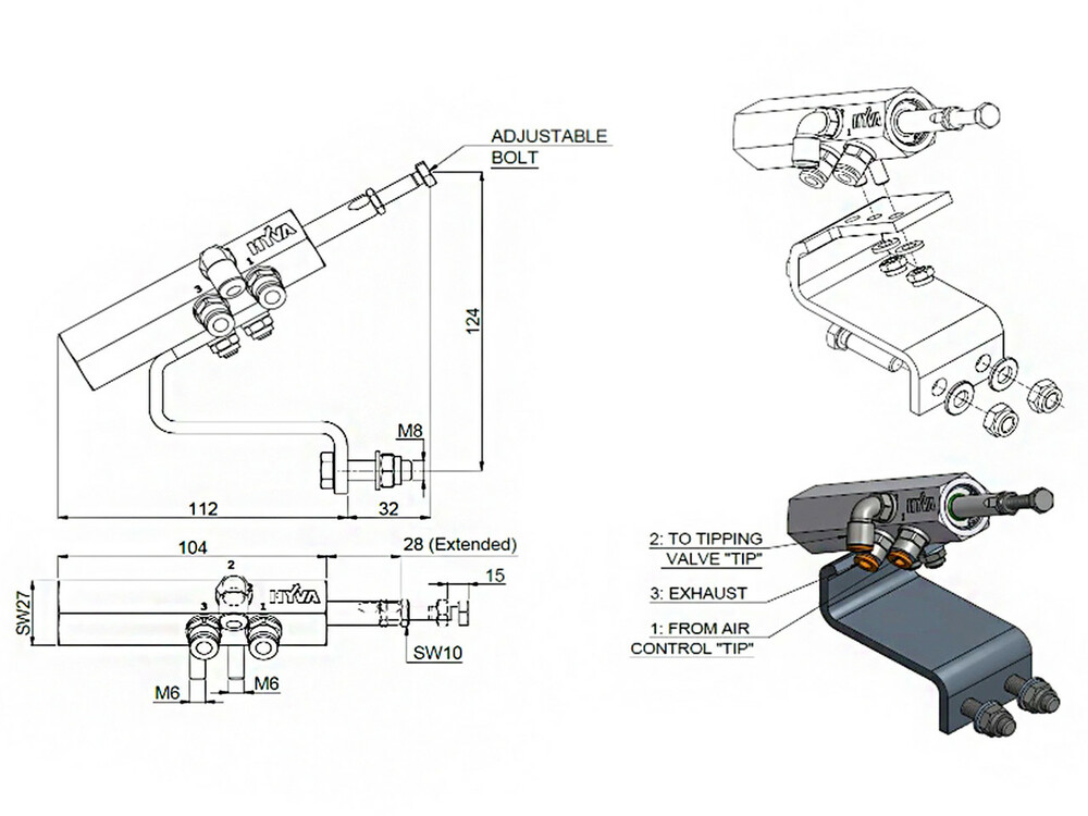 Управление пневматическим ограничителем совершается при помощи наклона рычага в любую сторону. Данный ограничитель хода применяется для работы самосвальных систем с трехсторонней разгрузкой.