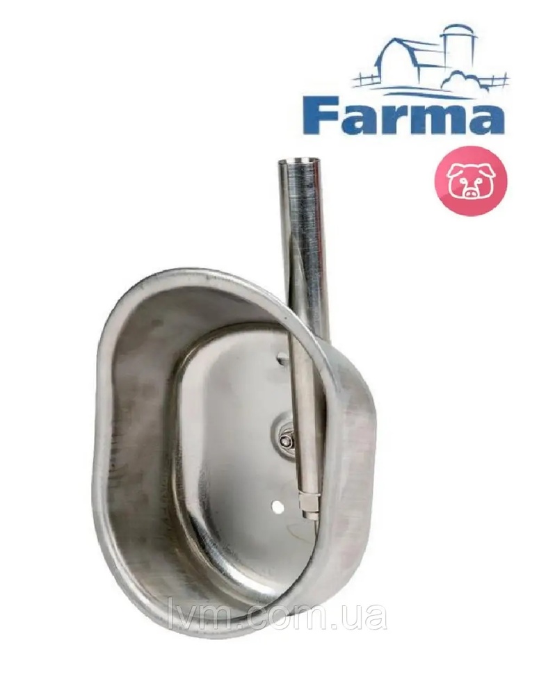 Харакетристика: Поїлка виготовлена із високоякісної сталі. Має глибину 12см, ширину 18см та висоту 27см. Завдяки овальній формі дана поїлка дуже зручна для великих порід свиней. Призначення для поїння свиноматок та поїнню свиней на відгодівлі. Кріплення 1/2, різьба для кріплення внутрішня. Напрямок підключення потоку води верхній.