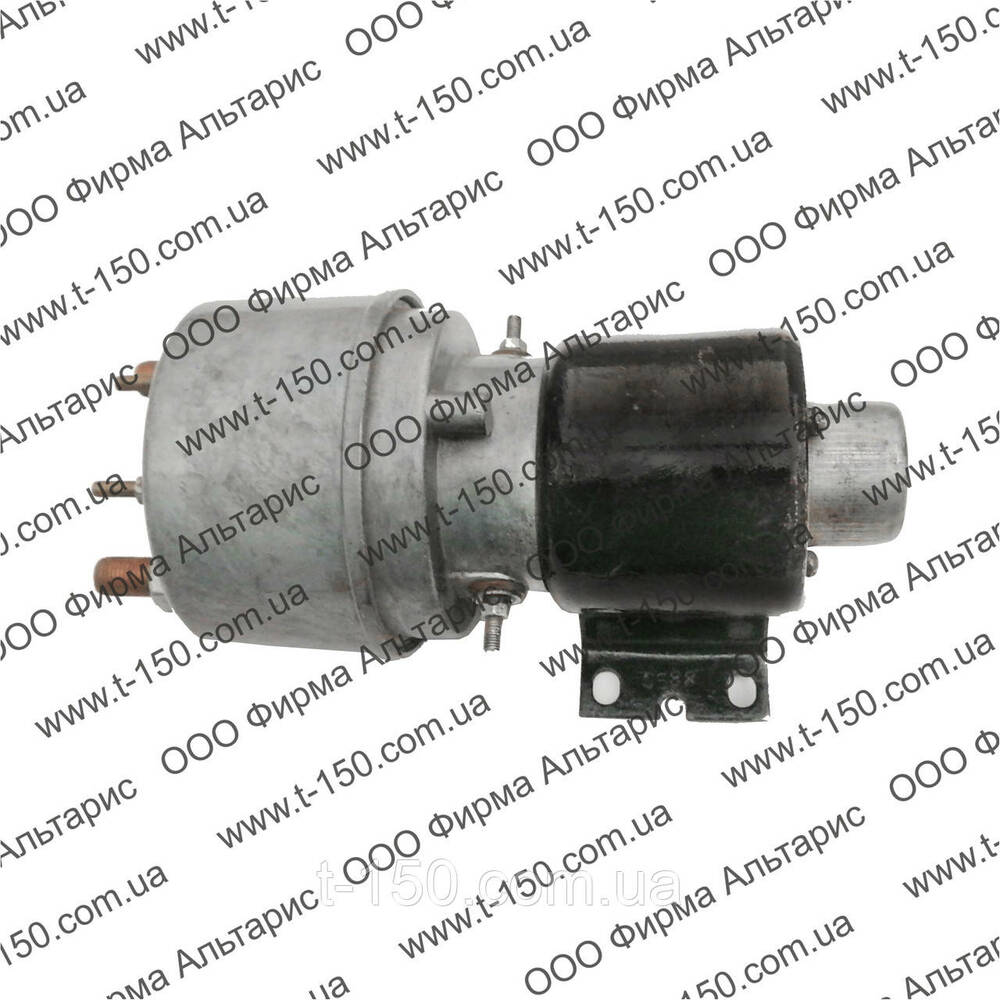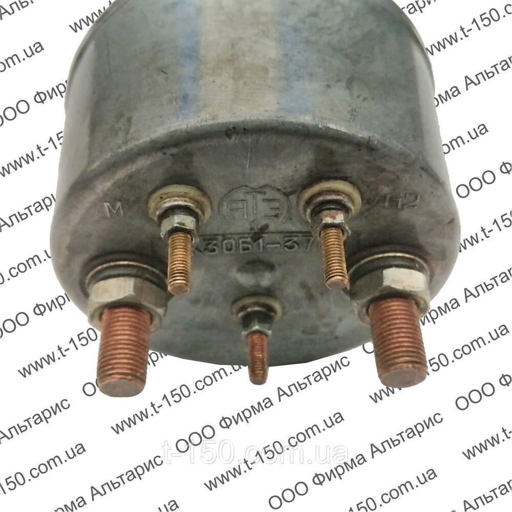 Переключатель стартера ВК30Б,переключатель аккумуляторных батарей 700.37.00.120 колесного трактора Кировец К-700,К-701.На тракторе устанавливаются две 12-вольтовые аккумуляторные батареи, по одной батарее с правой и левой стороны трактора. Каждая батарея состоит из шести двухвольтовых элементов, соединенных последовательно.При работе трактора батареи соединены параллельно, а при пуске батареи соединяются последовательно. Переключатель ВК30 Б предназначен для переключения аккумуляторных батарей с параллельного соединения 12 В на последовательное соединение 24 В для питания стартера и электродвигателя привода маслозакачивающего насоса. Переключатель состоит из контактной коробки с выводными клеммами для присоединения проводов, электромагнита с подвижным сердечником, контактов, подвижных контактных дисков (главного и дополнительного), главных контактов  и дополнительных контактов.