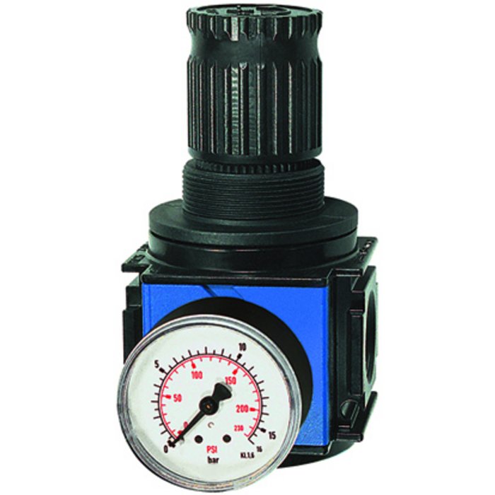 Diaphragm pressure regulators with self-relieving design for mounting side by side. The pressure setting can be locked by pushing the knob down. <br>By assembling two or more controllers together, it is possible to supply several working air circuits with different output pressures via a single supply line.