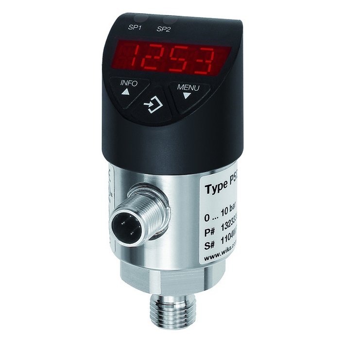 Electronic pressure switch with digital display, made of stainless steel, for monitoring and measuring pressures in liquids, gases or compressed air. Applications: Machine tools, compressors and pumps, hydraulic and pneumatic systems, machinery in general