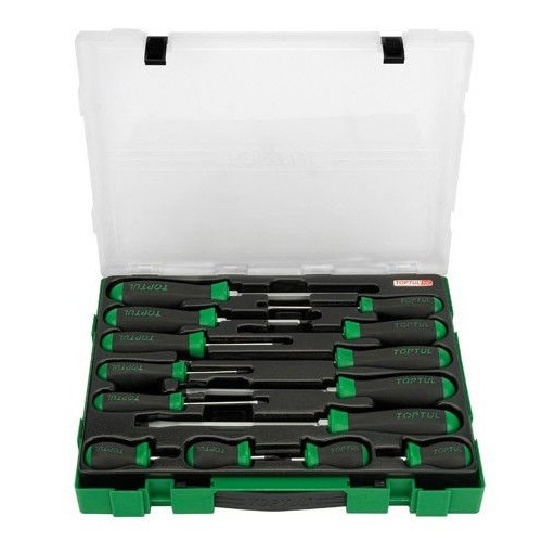 Профессиональный набор отверток 14 ед. TOPTUL GZC1401. Отвёртка - это один из востребованных и часто эксплуатируемый слесарный инструмент для вкручивания и отвинчивания крепежных деталей с резьбой и шлицом (паз) на головке. Существует широкий выбор отверток, таких как крестовые, шлицевые, ударного типа, универсальные с насадками и т.п., каждая из которых предназначена для определённой цели. Считается, что по своей популярности отвертка 1-я в списке самых необходимых слесарных инструментов. Ведь благодаря отвёртке можно проводить широкий спектр профессиональных слесарно-ремонтных работ, а также использовать в бытовой сфере.