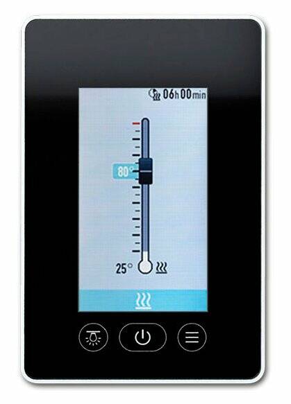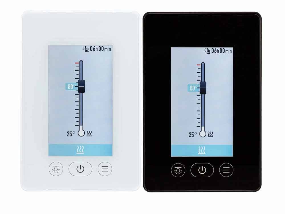Модель позволяет регулировать основные параметры — температуру, время работы, освещение и вентиляцию - через интуитивно понятную панель. При подключении парогенератора до 3 кВт становится доступно управление уровнем влажности. Пульт совместим с базовым блоком даже на расстоянии до 100 м, что открывает больше вариантов для монтажа. Стеклянная поверхность легко очищается и сохраняет красивый вид на протяжении всего срока службы.