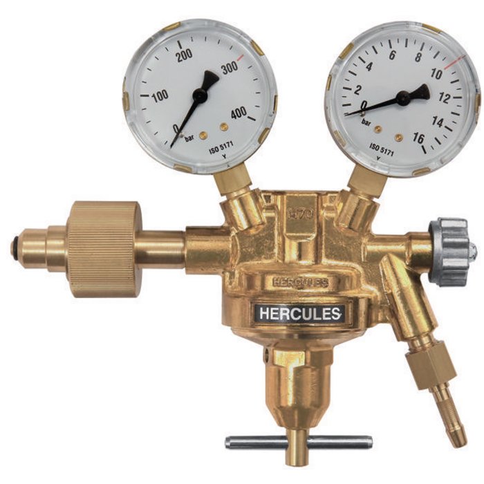 Single-stage type of construction acc. to DIN EN ISO 2503, with shut-off valve and safety valve as well as pressure gauges for the cylinder contents and working pressure.