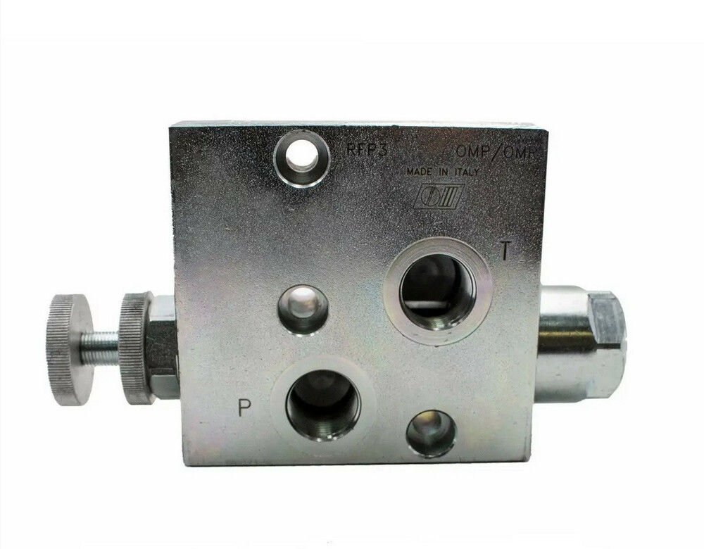 Регулятор расхода 3х линейный стыкового монтажа на гидромотор Oleodinamica Marchesini RFP3 1/2'' OMP/OMR предназначены для поддержания постоянного потока в линии потребителя "P" и свободного слива избыточного потока в канал "T". Максимальное давление в напорной линии ограничивается предохранительным клапаном.
