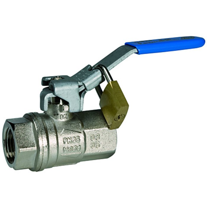 2/2-way safety ball valves made of nickel-plated brass. Specially designed for pneumatic applications. The ball valve can be locked manually. Full bore, heavy-duty type.