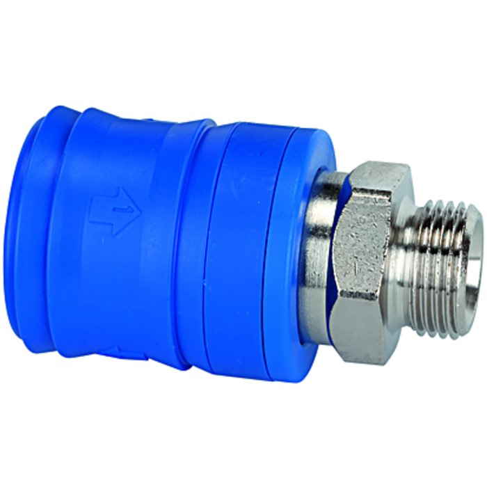 One-hand air relief couplings with double locking system. Connection: Similar to standard couplings, simply by pressing the plug into the coupling. Disconnection: The first locking mechanism is accessible when the sleeve is pushed back. The coupling valve closes. Air can then then be relieved from the plug side (hose). The second locking mechanism is released by actuating the sleeve again. The coupling can now be disconnected. This system meets the requirements of ISO 4414 and is BIA-compliant (BIA = industrial safety institute).