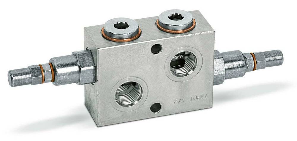 Этот клапан, состоящий из 2 предохранительных клапанов со скрещенным резервуаром, используется для блокирования давления до определенной настройки в 2 портах привода / гидравлического двигателя. Он идеально подходит для защиты от внезапных ударных давлений, а также для регулировки различных давлений в 2-х портах гидравлического контура. 6 портов (2 входа и 4 выхода реверсивные) позволяют использовать только 1 клапан на 2 цилиндра.