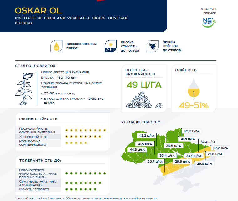 ОСКАР НС — раннеспелый высокоолеиновый гибрид подсолнечника, сербской селекции, с потенциалом урожайности до 5 т/га.