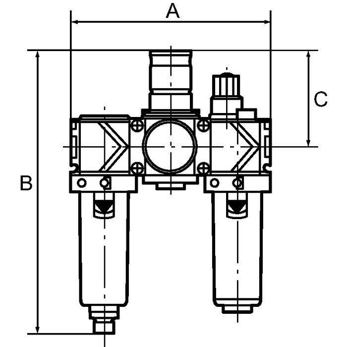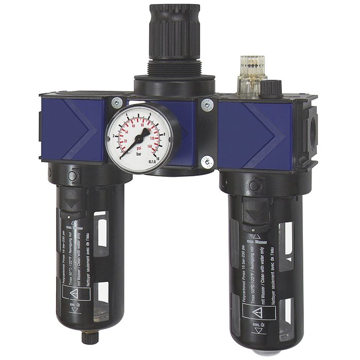 Two or three-piece service units consisting of a reversible diaphragm pressure regulator, independent of inlet pressure, with self-relieving design, combined with a centrifugal separator and a proportional lubricator. Approved series in modern industrial design, with the following key benefits: Simple handling, Convenient modular assembly thanks to innovative fasteners, Excellent flow values.