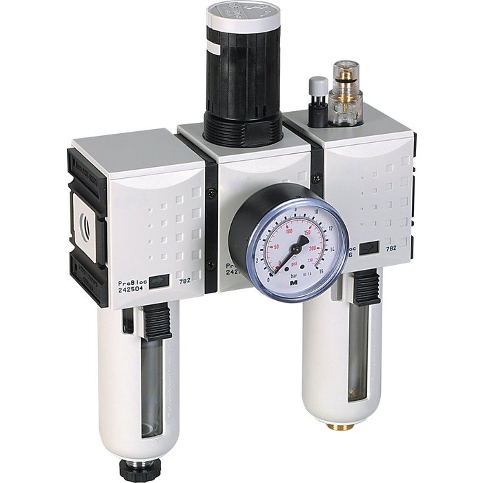 Two or three-piece service units with excellent flow rates in modern design. <br>Lockable diaphragm pressure regulator with secondary ventilation, oil can be filled without interrupting operation.<br>
