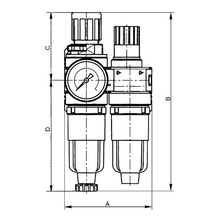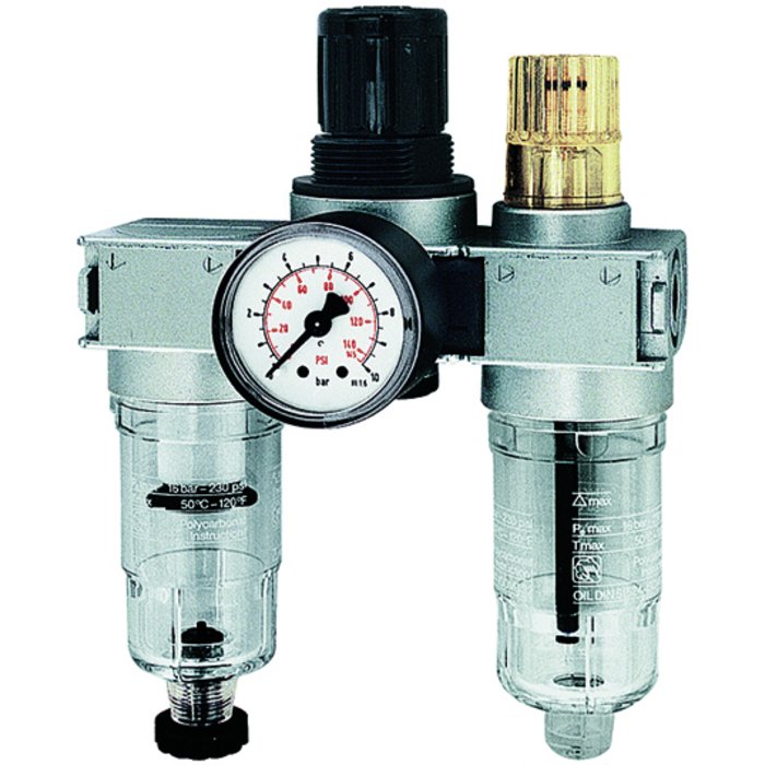 Two or three-piece service units consisting of a diaphragm pressure regulator, independent of inlet pressure, with self-relieving design, combined with a centrifugal separator and a proportional lubricator.