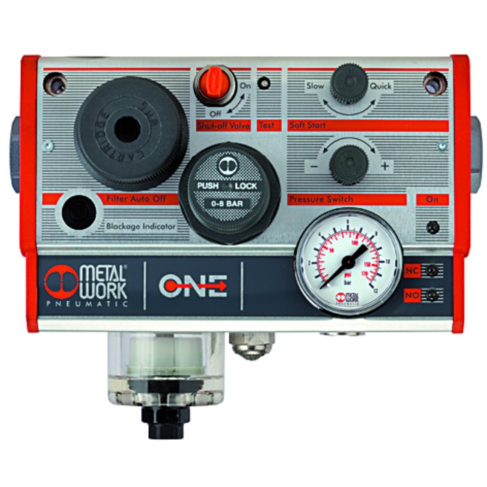 Multifunctional service unit with 6 or 7 functions in a single device: 3/2-way valve (manually operated), filter with automatic drain valve, air ports, pressure regulator, pressure gauge, soft start valve and optional: pressure switch. This combination of extremely good flow rates and a wide range of functions integrated in a single, compact unit saves valuable space and is unmatched by any similar product available in the market! Soft starting independently of the load and easy replacement of the filter cartridge under pressure are just two of the other outstanding features of this amazing device.