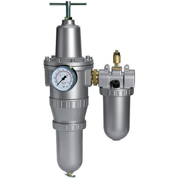 Two-piece service units consisting of a reversible diaphragm pressure regulator, independent of inlet pressure, with self-relieving design, combined with a centrifugal separator and a proportional lubricator.