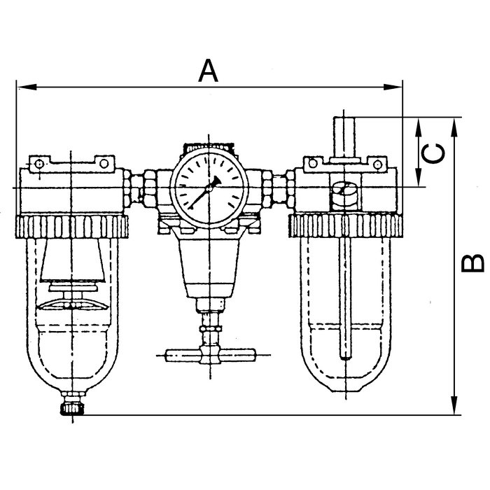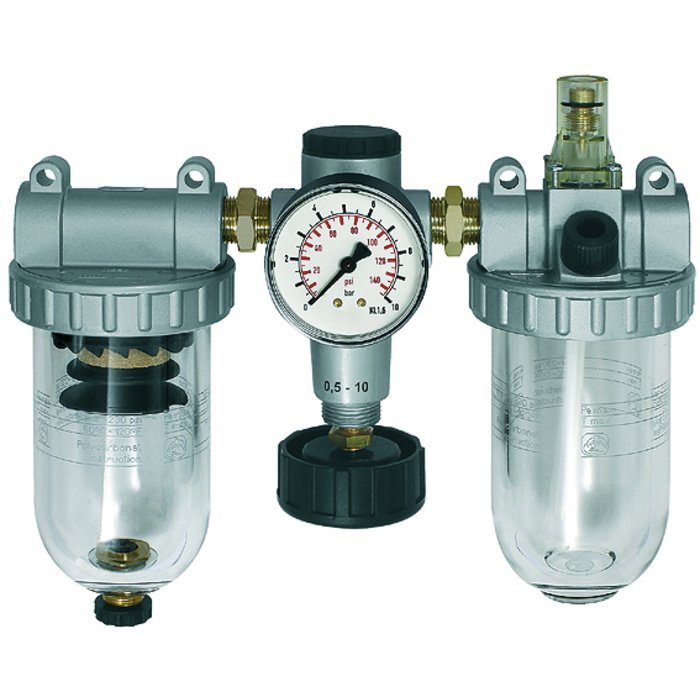 Three-piece service units consisting of a reversible diaphragm pressure regulator, independent of inlet pressure, with self-relieving design, centrifugal separator and proportional lubricator.