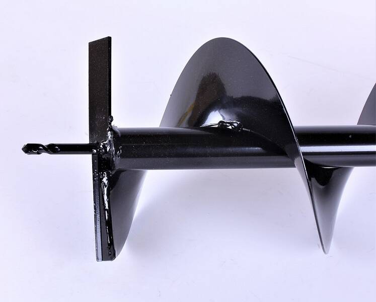 Шнек L1000, диаметр 200 ТАТА MB — данный шнек подходит к большинству двигателей с выходным валом диаметром 20 мм. На конце шнека приварены 2 лопасти ножа, которые срезают слои почвы выталкивая их из отверстия. Используется для бурения отверстий, наиболее распространенное примирение — для изготовления лунок под опоры забора, столбиков под виноград, строительных работ.