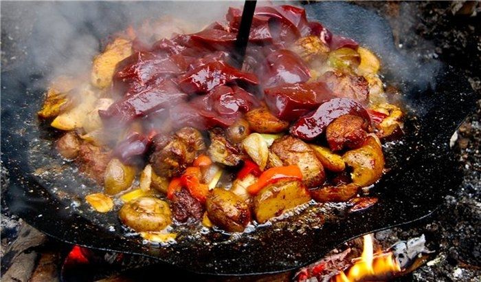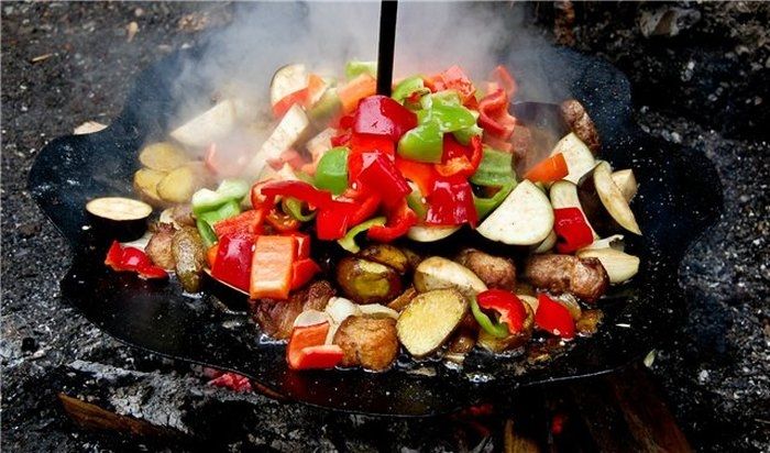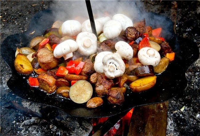 Дана сковорода згодиться на маївці, рибалці, пікніку, полюванні, в поході, а також при будь-якому виїзді на природу. Сковорода ідеально личить для приготування будь-якого блюда з картоплі, овочів, м'яса, риби, яєць. У комплект входить: основна частина – сковорода (D=55 см), штир який вставляється в центр костриці (L=100см), на необхідній висоті над вогнищем сковорода фіксується задопомогою різьбового зєднання. Сковорода дуже добре тримає температуру що дозволяє приготованій їжі довше знаходитись у теплому стані.