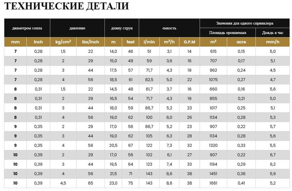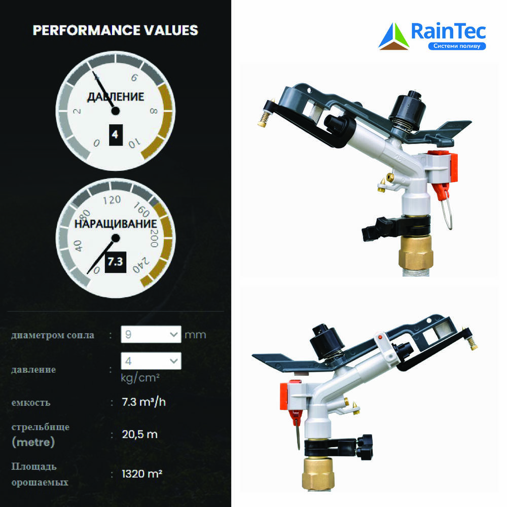 Высокоэффективная дождевальная головка, работающая при среднем давлении  (от 2,0 до 4 атм), совершающая полный круг или обеспечивающая возможность регулирования угла поворота, с кулачком рефлектором. Благодаря сменным наконечникам и выходу воды из двух отверстий, обеспечивает великолепное распределение воды и отличное орошение. Благодаря заглушке в комплекте второе отверстие может быть заглушено. Это позволяет снизить расход воды.