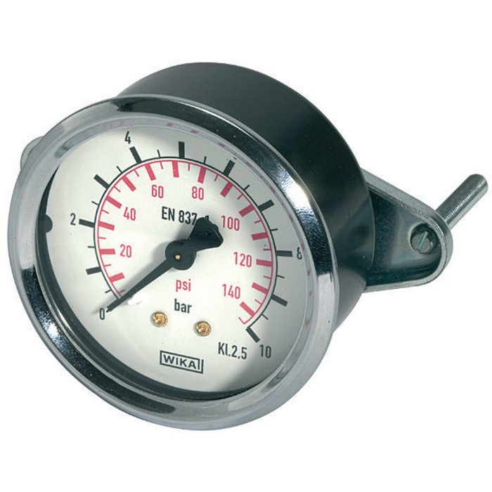 Standard pressure gauges with 3-hole bezel, chrome-plated steel, dual scale in bar/psi and clamp fixing, connection on r