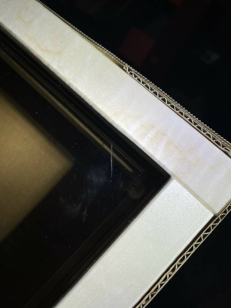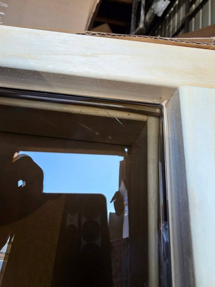 Причина уценки: видимые при определенном освещении царапины и потертости, образовавшиеся при транспортировке, на стекле по обе стороны в зоне петель.