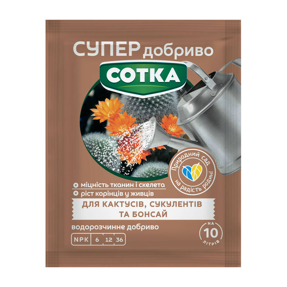 Супер удобрение Сотка для кактусов, суккулентов и бонсай – это специально разработанный водорастворимый минеральный комплекс, обеспечивающий полноценное питание декоративных растений с толстыми листьями и стеблями. Формула с высоким содержанием калия (NPK 6:12:36) способствует формированию прочной структуры тканей, стимулирует рост корней и повышает устойчивость к заболеваниям.