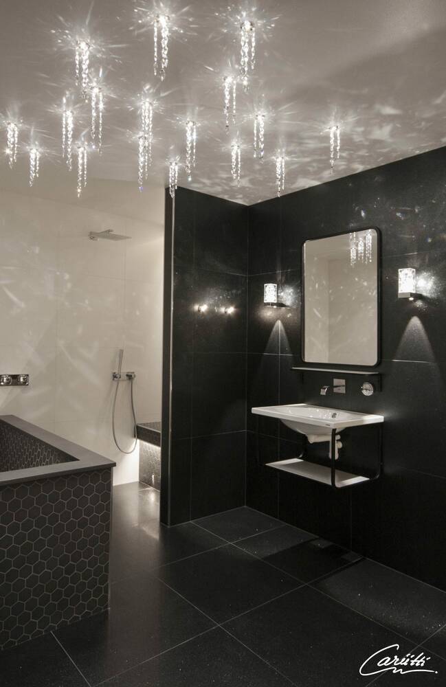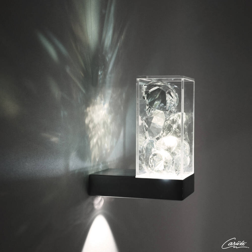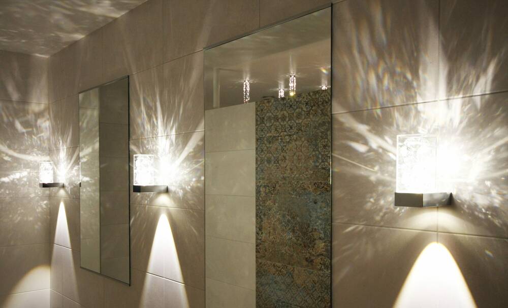 Через хрустали свет отражается на стену и образует красивые и интересные рисунки. Вниз направляется свет теплого цвета.