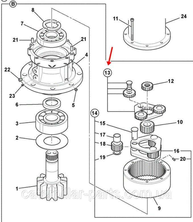 459/10165 Перша планетарна передача редуктора JCB. Купити запчастини для спецтехніки можна у Києві безпосередньо з нашого складу. Всі запчастини в мости та КПП ми поставляємо безпосередньо від виробника. Ремонт мостів та трансмісії проводить наш сервісний центр з ремонту спецтехніки та двигунів (Київ, Україна).459/10165 Перша планетарна передача редуктора повороту у зборі JCB JS115-JS145