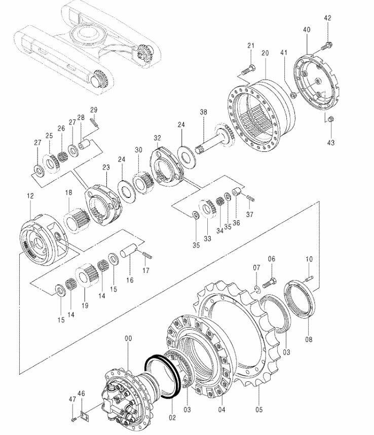 Редуктор ходу Hitachi - це гідравлічний механізм, який передає крутний момент від двигуна до гусениць або колес екскаватора Hitachi. Редуктор ходу керує швидкістю руху машини та забезпечує її маневреність. Зазвичай редуктор ходу складається з корпусу, в якому знаходяться зубчасті колеса та підшипники, а також механізми керування, такі як гідравлічні циліндри та клапани. Редуктори ходу можуть бути різних типів, залежно від типу екскаватора та специфікацій виробника.