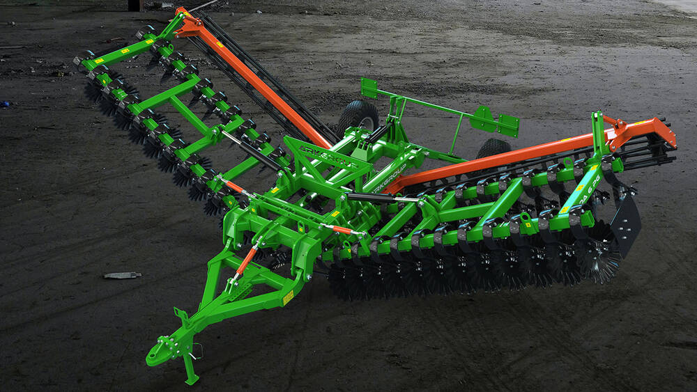 ПЕРЕВАГИ ОБРОБКИ ДАНИМ АГРЕГАТОМ ↘ Кожен ряд дисків заходить ґрунт під кутом атаки 16° переднього ряду та 19° заднього ряду робочих органів ↘ Форма дисків сприяє кращому перерізанню рослинних решток. Це також зменшує опір землі агрегату, тому економить паливо й підвищує продуктивність ↘ Можливість заміни диска, не розбираючи підшипника ↘ Висока швидкість роботи ↘ Багатофункціональне налаштування за індивідуальними потребами.