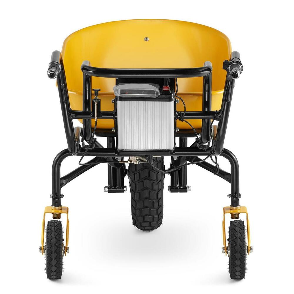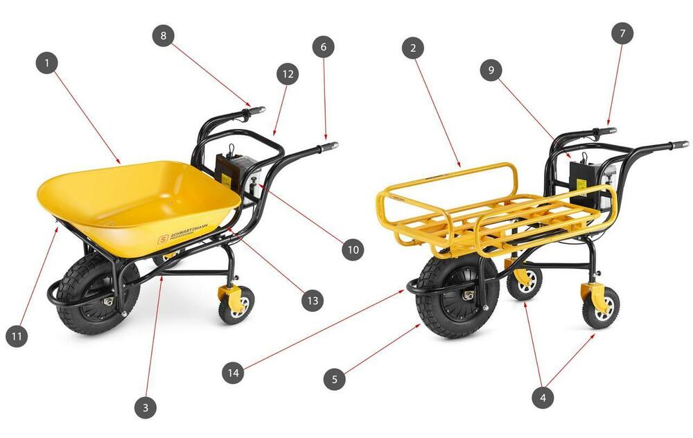 Электрическая тачка Schwartzmann оснащена прочной желтой чашей с порошковым покрытием и максимальной загрузкой 120 л, что позволяет перевозить материалы весом до 150 кг.