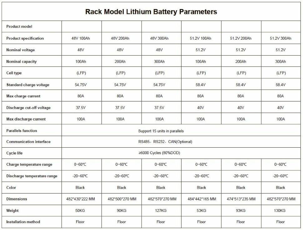 Акумуляторна батарея LiFePO4 (літій-залізо-фосфатна) установка на стійку. Повністю нові клітини класу A, розрахунковий термін служби 20 років. Вбудована інтелектуальна BMS (battery management system - система управління акумулятором), сумісна з інверторами понад 20 марок. За допомогою РК-екрану можна контролювати дані про акумулятор. Підтримка паралельного підключення для розширення ємності до 15 пристроїв паралельно. Інверторний кабель передачі даних (RS485/CAN).