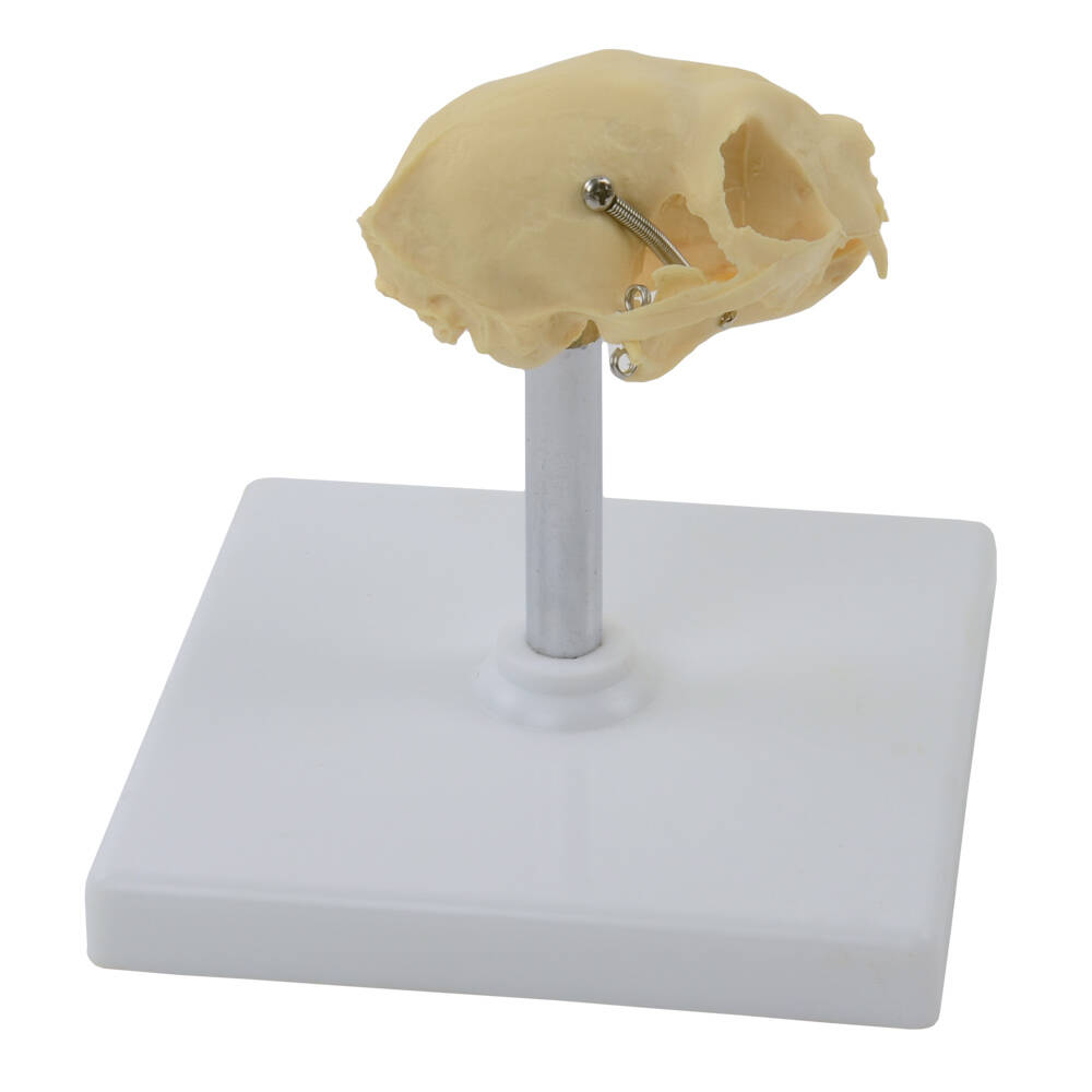 Анатомічна модель черепа кота являє собою детальний пластиковий зліпок скелета голови кота середнього розміру. Нижня щелепа рухомо прикріплена до черепа для демонстрації рухів та можливості детального огляду зубів та щелеп.