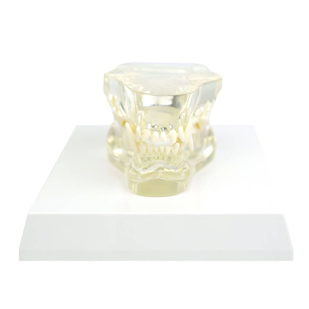 Прозора модель собачої щелепи візуалізує здоровий жувальний апарат дорослої собаки. Представлені різці, ікла, премоляри та моляри з коренями. Відкривання, закривання та розділення верхньої та нижньої щелеп дозволяє більш цілеспрямовано спостерігати за окремими ділянками. Ця модель щелепи використовується у ветеринарних клініках і практиках для пояснення будови щелепи собаки власникам пацієнтів, а також для з'ясування поточних проблем і можливих методів лікування.