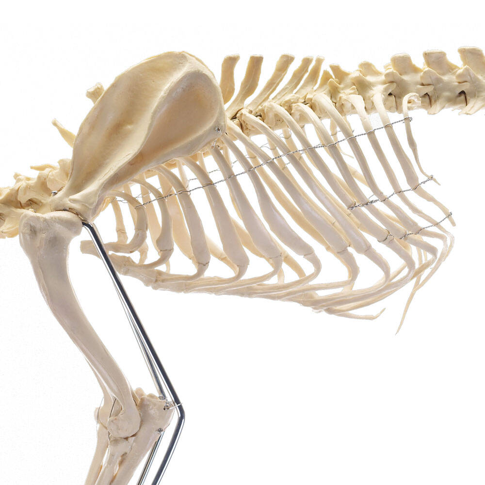 Велика анатомічна модель скелета собаки являє собою пластикову репліку скелета великої собаки, розміру бобтейла або коллі, виготовлену з окремих частин методом лиття. Модель скелета частково розбирається і має рухому нижню щелепу, що дозволяє детально вивчати зуби собаки.